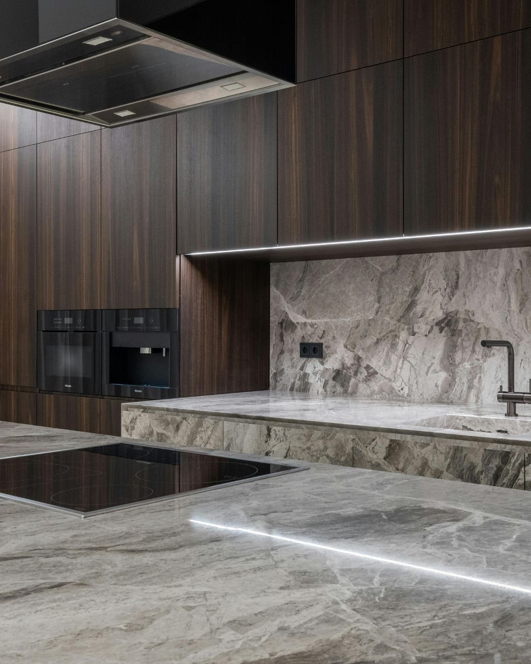 Cocinas modernas en tonos oscuros que combinan sofisticación, funcionalidad y diseño vanguardista.